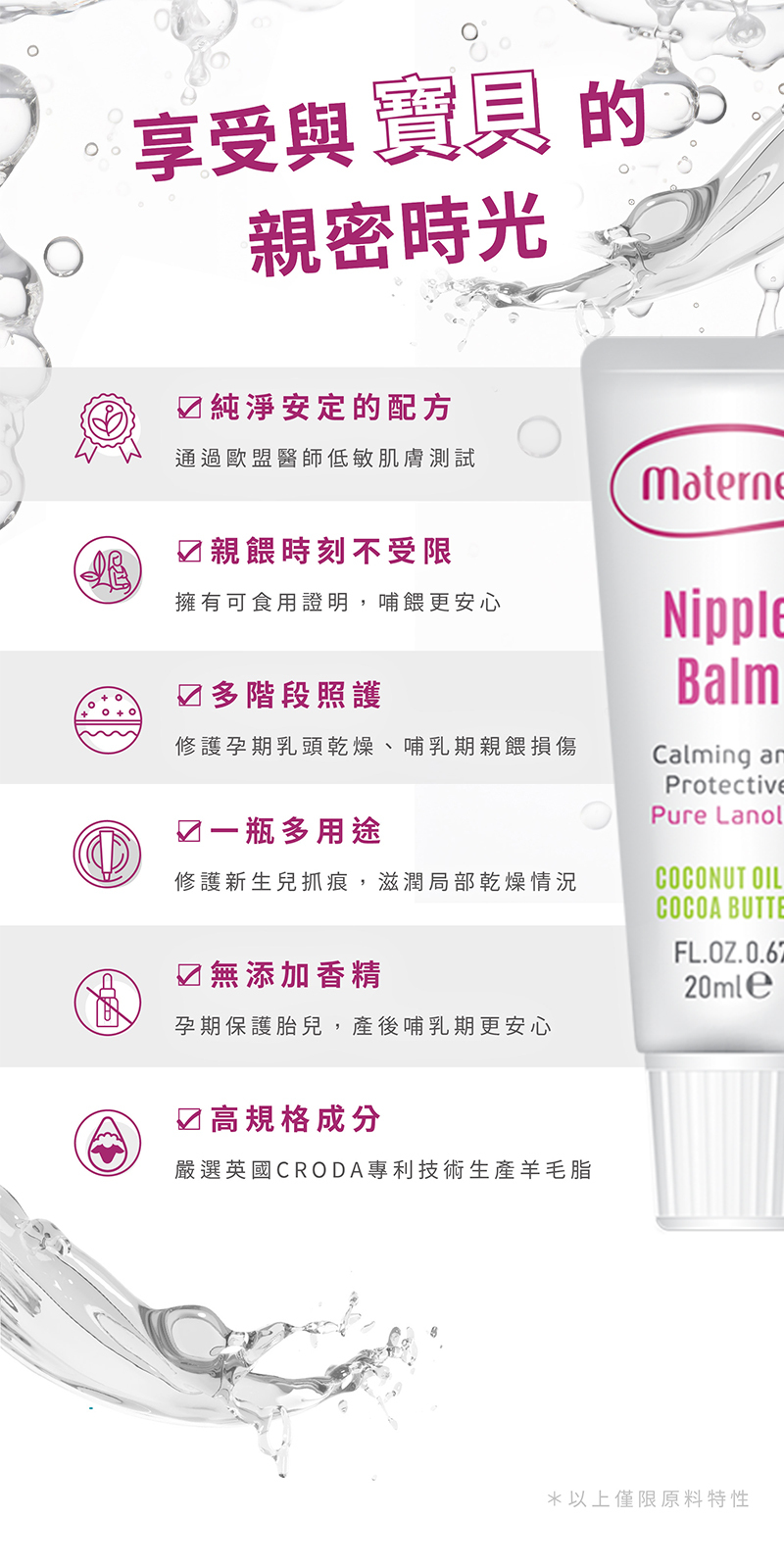 Imported directly from Europe, gentle and fragrance-free. Selectively uses lanolin produced with CRODA's patented technology in the UK, manufactured through high-standard procedures, offering the highest level of care for pregnant mothers. The nipple repair cream contains cocoa butter, coconut oil, and shea butter, rich in essential fatty acids to moisturize, soften, and keep skin healthy. It also contains Vitamin E for skin hydration, with Provitamin B5 and Bisabolol to alleviate nipple discomfort. The formula is pure, stable, free of colorants and fragrance, and all products come with European usage test reports.