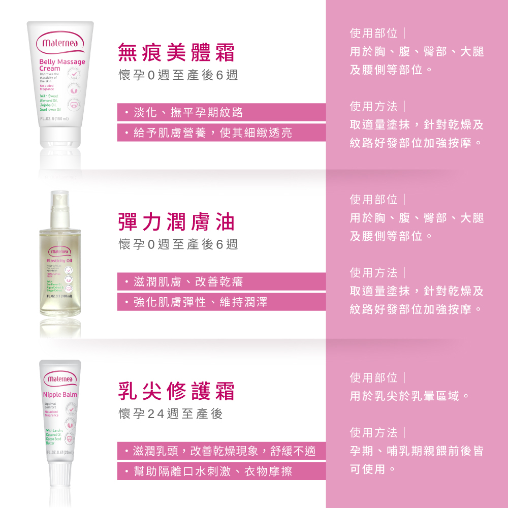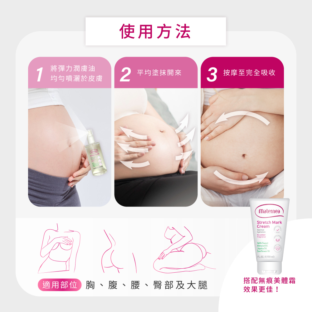 → 每日早晚使用,先用彈力潤膚油,待油吸收後再擦上無痕美體霜。(乾性肌膚的媽咪可以在中午或下午適時地補擦)