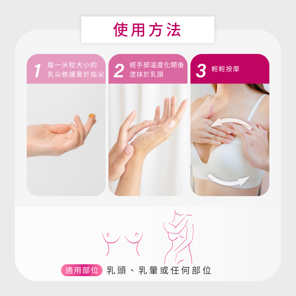 → 以手心溫度,由下而上均勻塗抹。最後按摩至完全吸收後再穿上衣服。