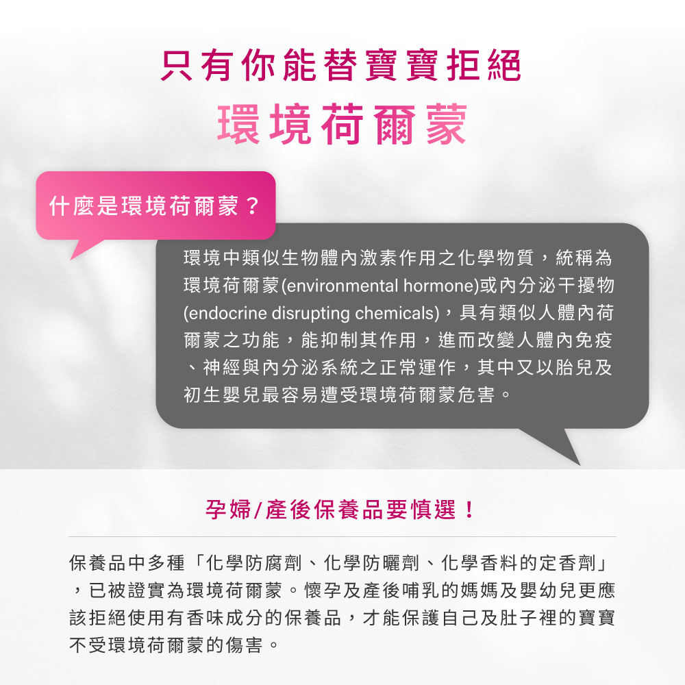 堅持純淨安定、無色素、無香配方,是孕期保養的安心首選。