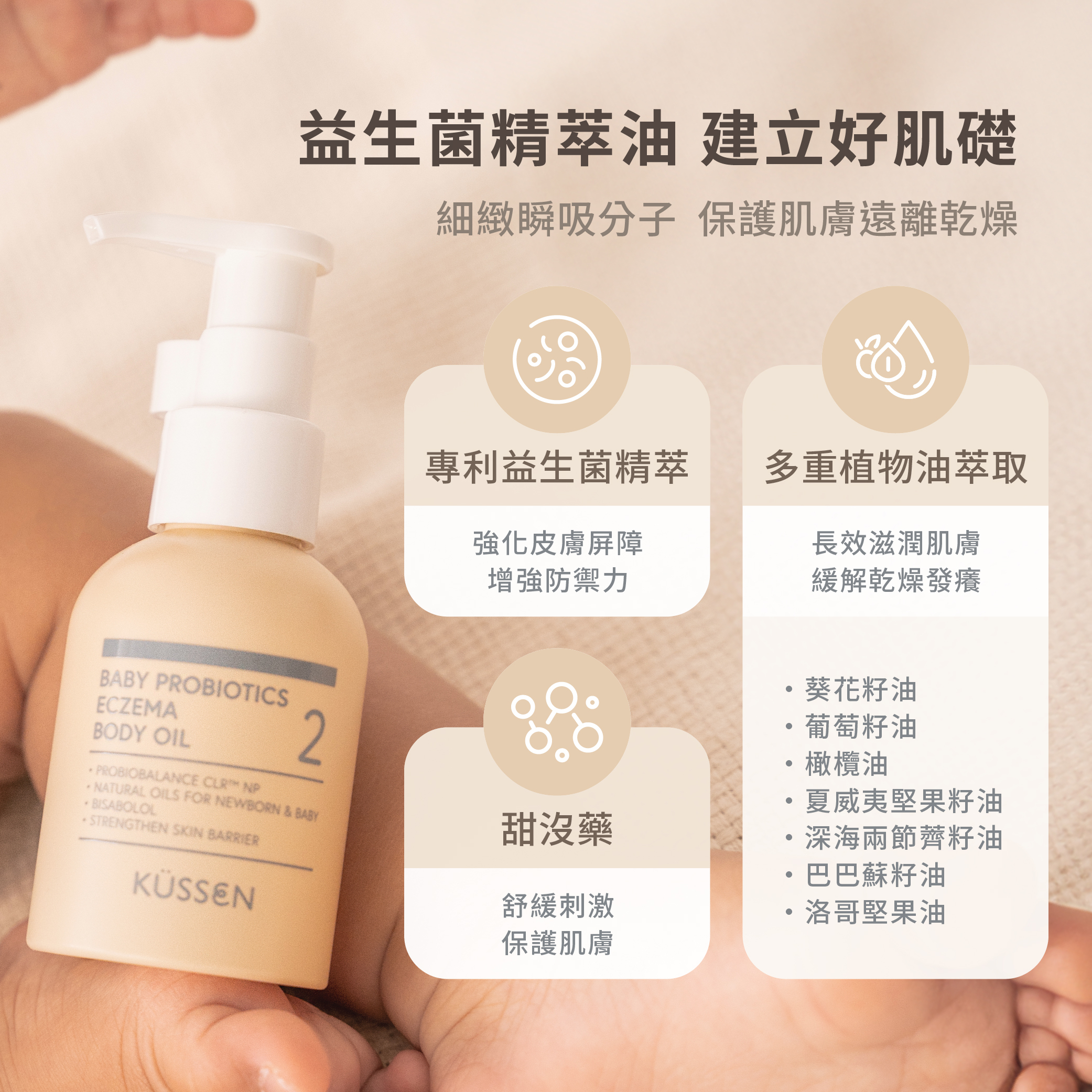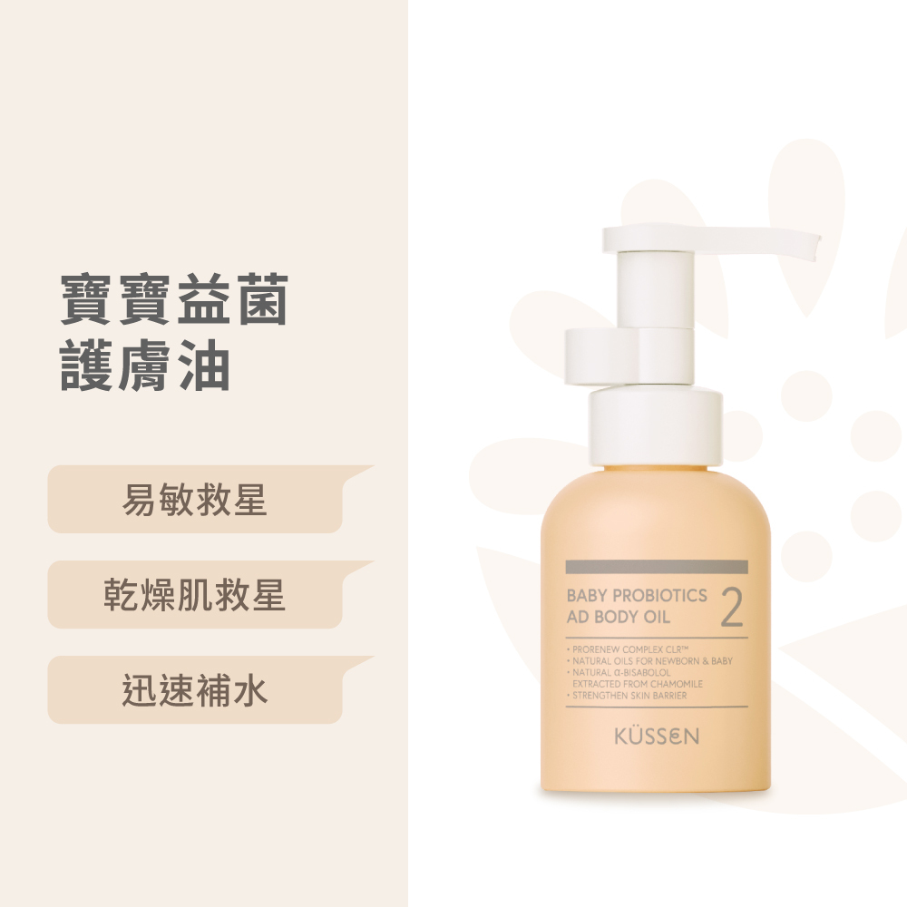 細緻的油分子能幫助寶寶的嬌嫩肌膚免於乾燥,內含德國專利益生菌技術ProRenew Complex CLR™,幫助平衡皮膚生態,強化自然屏障。嚴選舒緩成分甜沒藥醇,搭配多種有機認證植物油,有助於舒緩不適、對抗乾癢。高親膚性油脂,質地輕盈、吸收快速,能幫助脆弱的肌膚達到高效的保濕與防護。