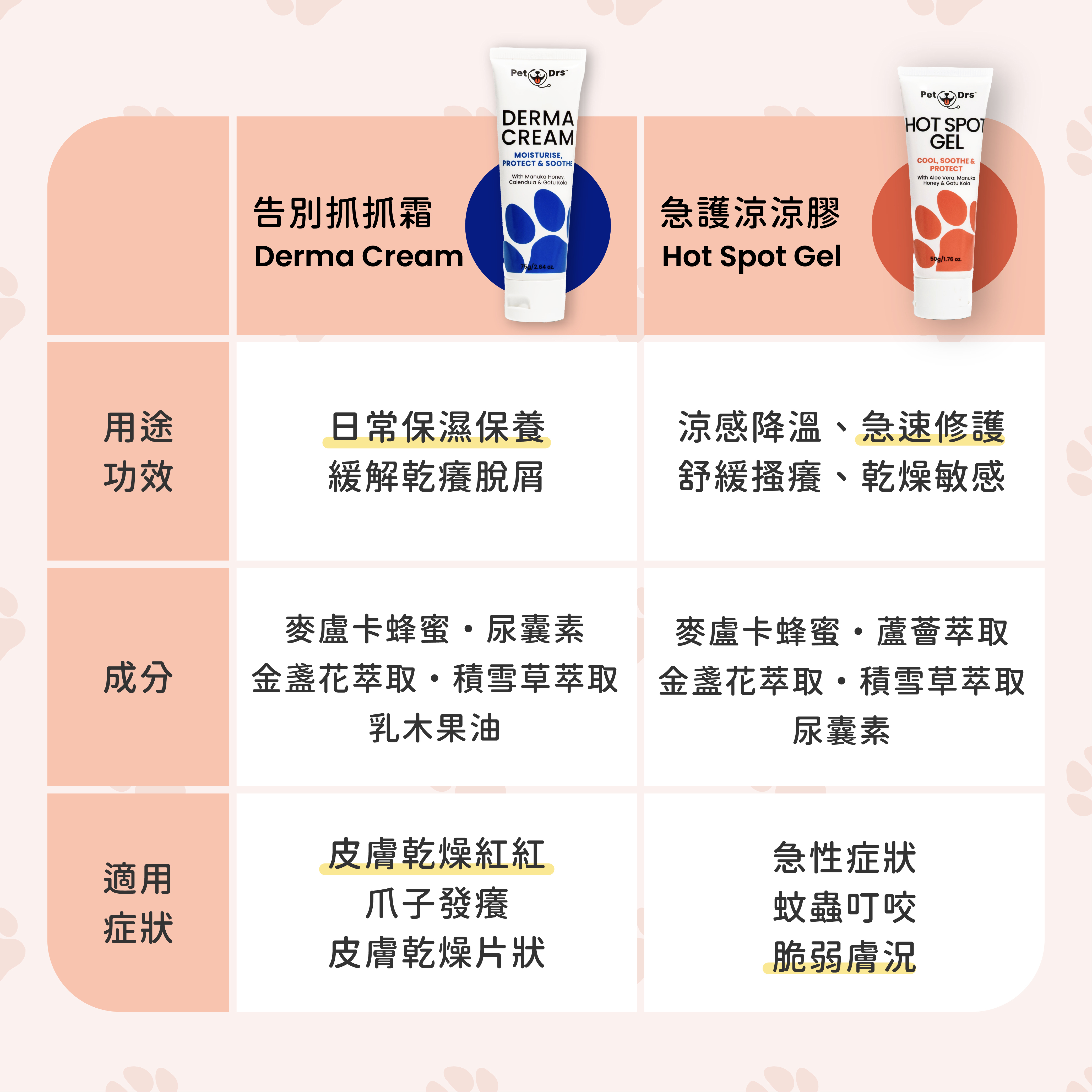 每天先 #涼涼膠 舒緩降溫,後 #抓抓霜 滋潤止癢,搭配 #肉球棒棒 修護腳掌龜裂,有異味就用 #香噴噴 抗菌除臭