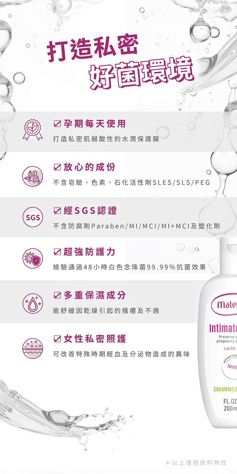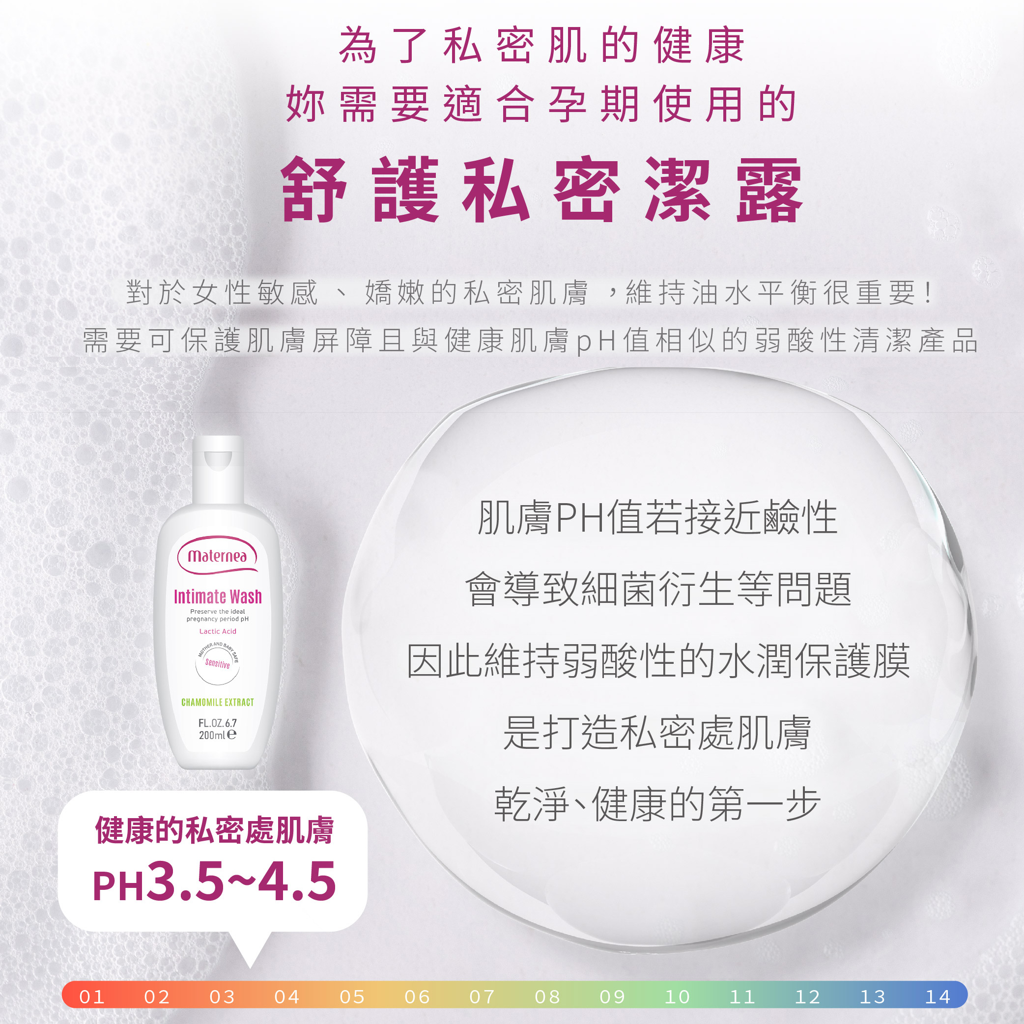 Maternea exclusive formula uses natural cleansing agent Lauryl Glucoside that is biodegradable. It's free from alkali soap, colorants, petrochemical surfactants SLES/SLS/PEG, and certified by SGS to be free from preservatives such as Paraben/MI/MCI/MI+MCI, etc., making it suitable for daily use by all women, including those who are pregnant or postpartum.