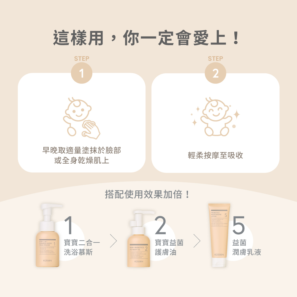 使用方法:每日早晚,取適量益菌潤膚乳液塗抹於臉部及全身肌膚,推勻按摩至吸收,能幫助皮膚潤澤保濕。