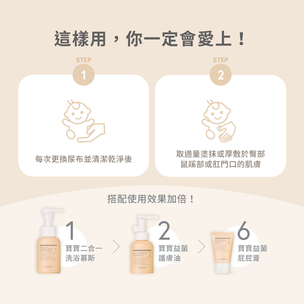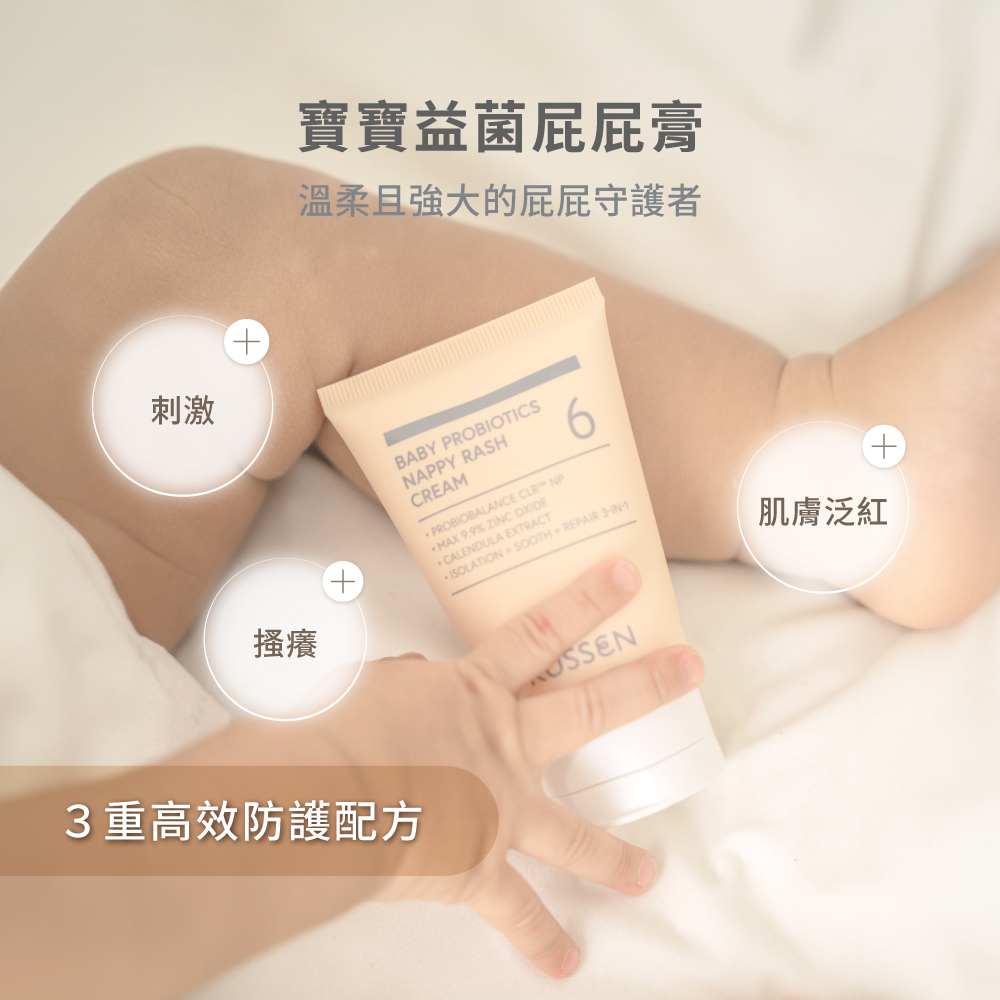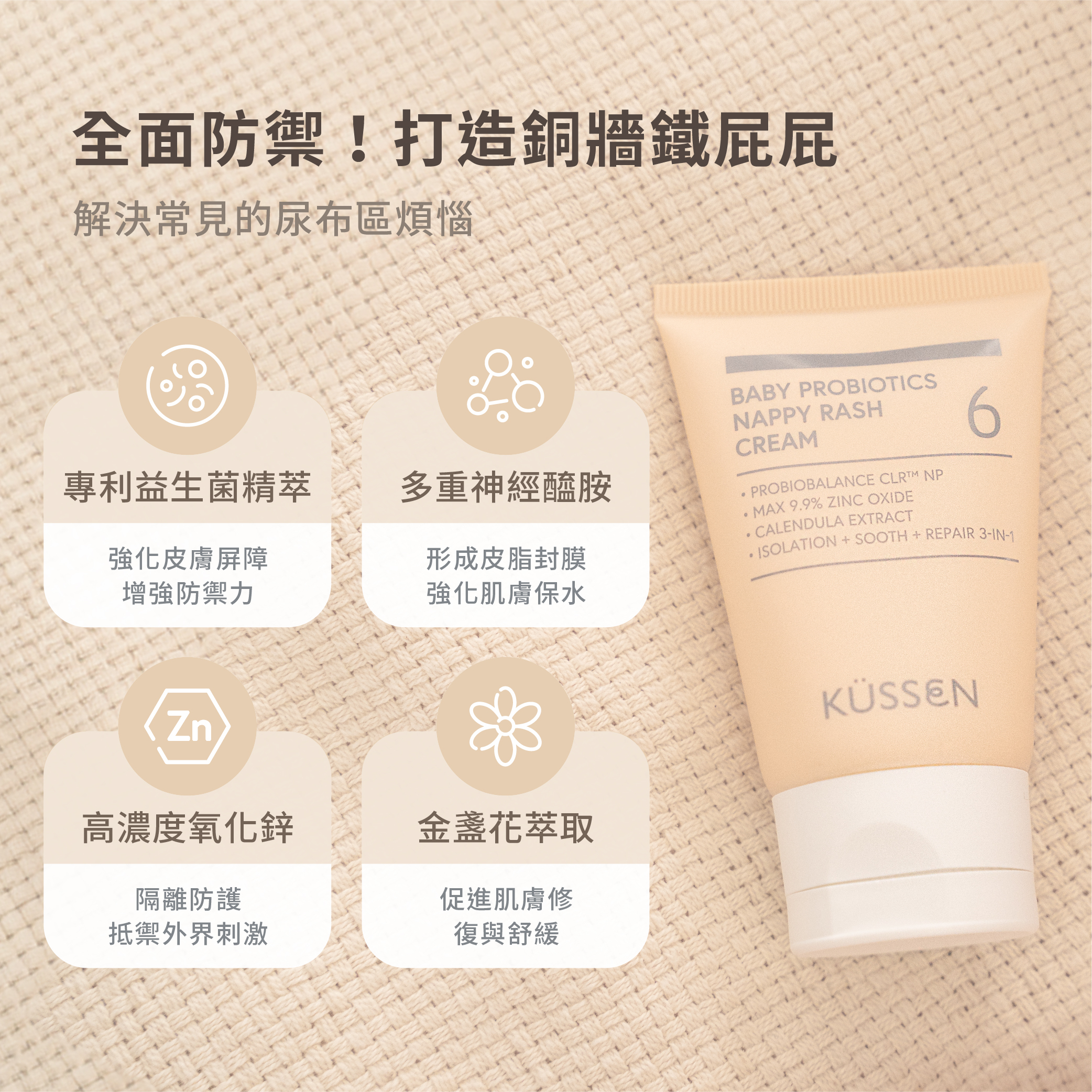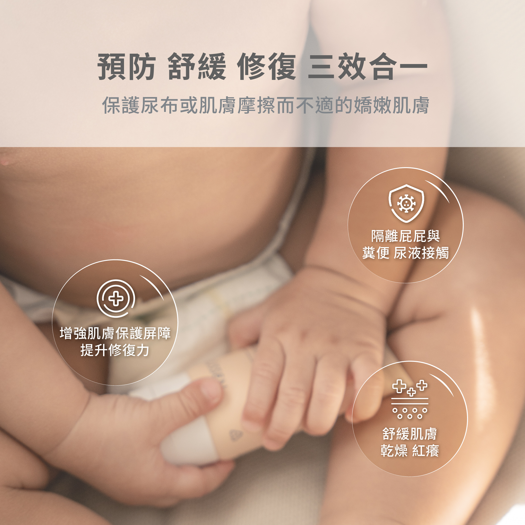 專為新生、嬰幼兒屁屁肌膚所開發之防護配方,具有隔離、舒緩、修護三重功效。9.9%高濃度氧化鋅添加,有助於形成不透水的保護屏障,隔絕皮膚與糞便、尿液的接觸,有效預防臀部周圍肌膚的不適;搭配德國專利益生菌技術及複方神經醯胺,能強化皮膚屏障,解決多種皮膚需求,讓寶寶的屁屁肌膚維持在最好的狀態。