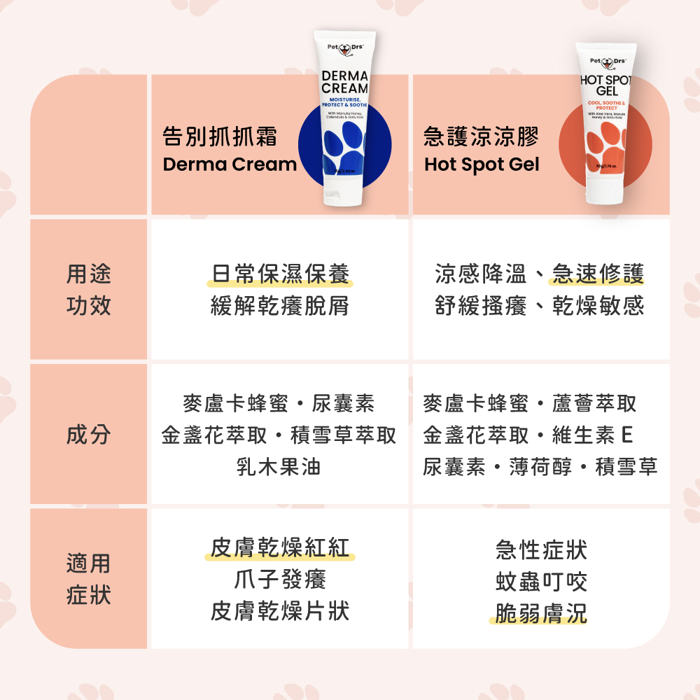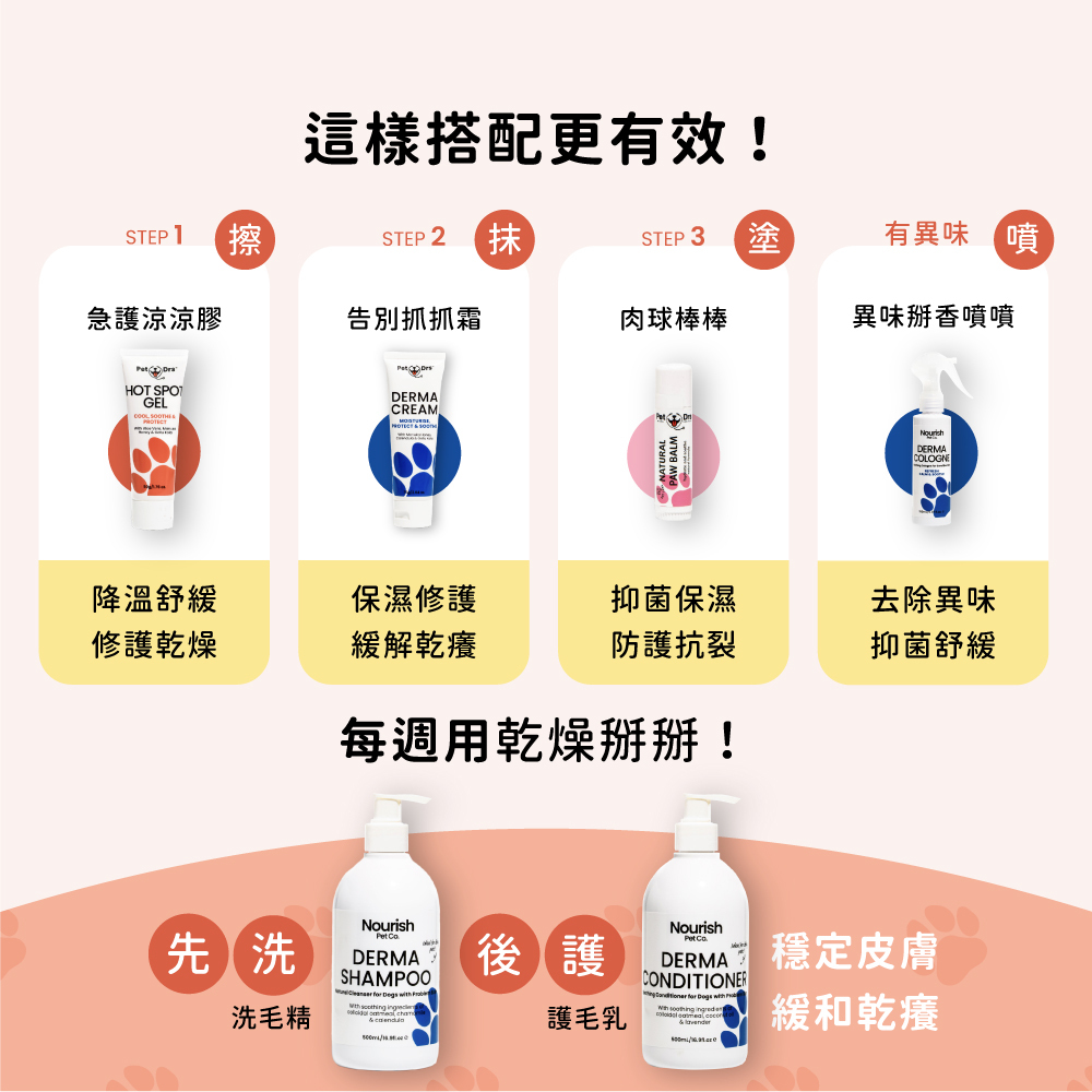 每天先 #涼涼膠 舒緩降溫,後 #抓抓霜 滋潤止癢,搭配 #肉球棒棒 修護腳掌龜裂,有異味就用 #香噴噴 抗菌除臭