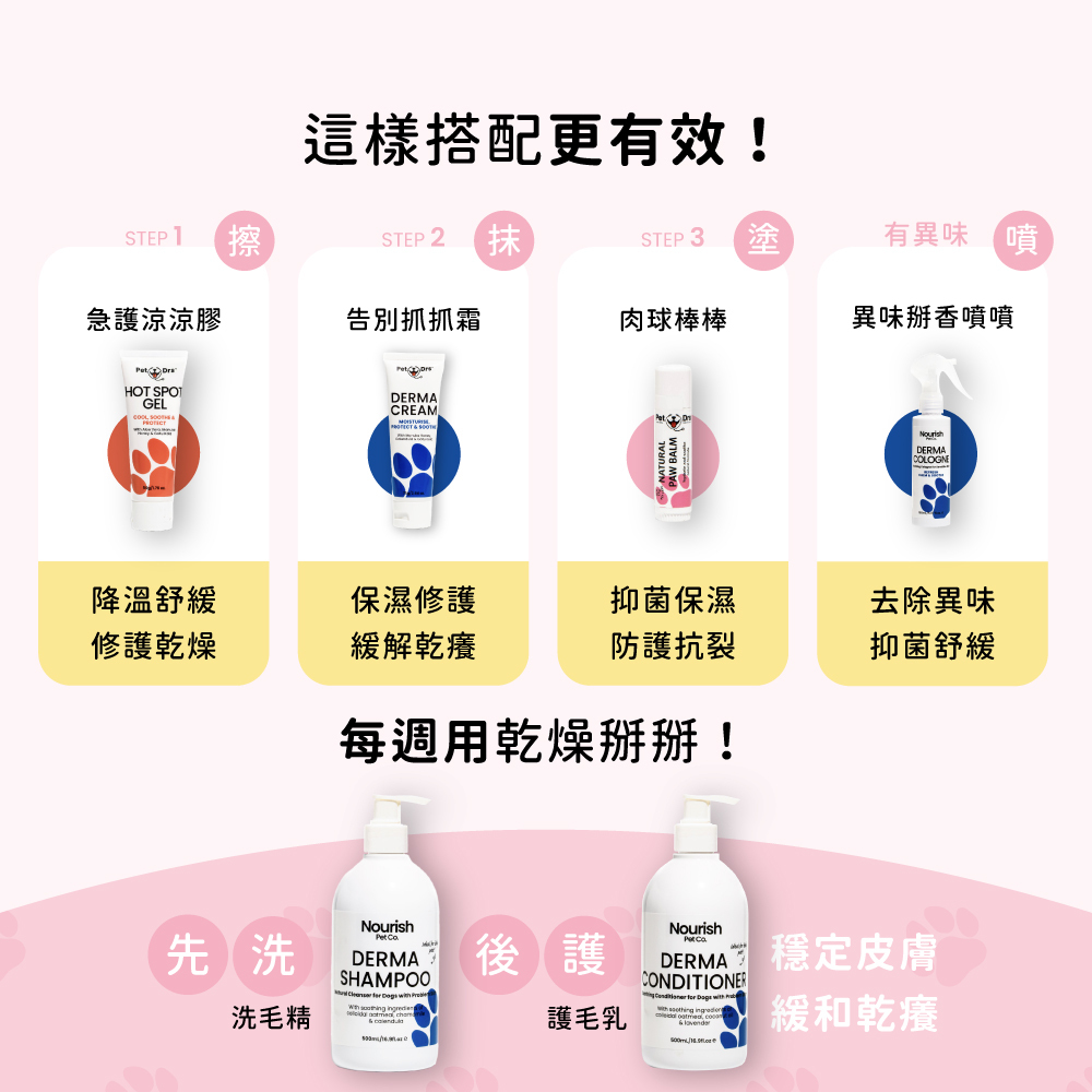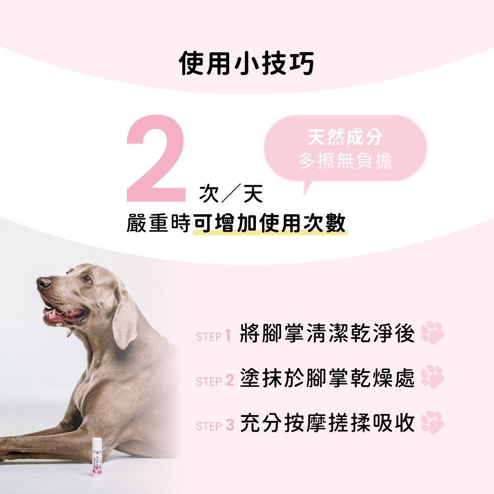每天先 #涼涼膠 舒緩降溫,後 #抓抓霜 滋潤止癢,搭配 #肉球棒棒 修護腳掌龜裂,有異味就用 #香噴噴 抗菌除臭