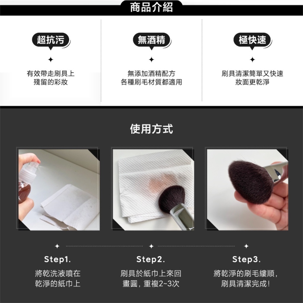 用法:乾洗液噴於紙巾上,將欲清潔之刷具於紙巾上來回至殘色去除即可,建議少量多次使用。