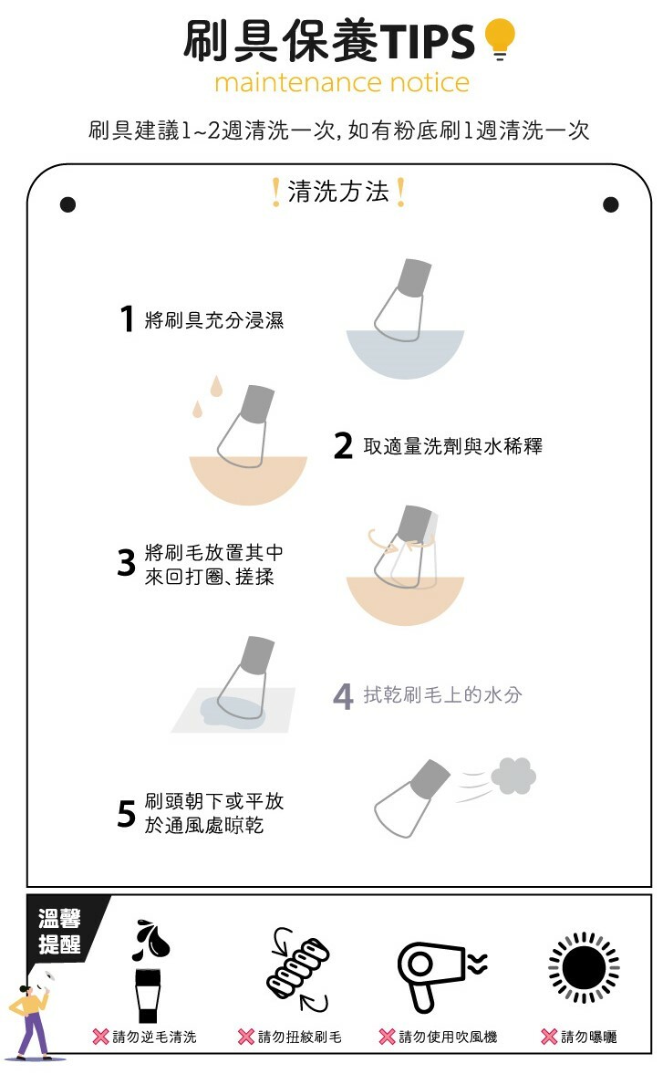 1.為個人衛生起見請避免共用刷具,一週建議清洗一次刷具避免細菌滋生。使用中性清潔液清洗,放置陰涼處晾乾即可。